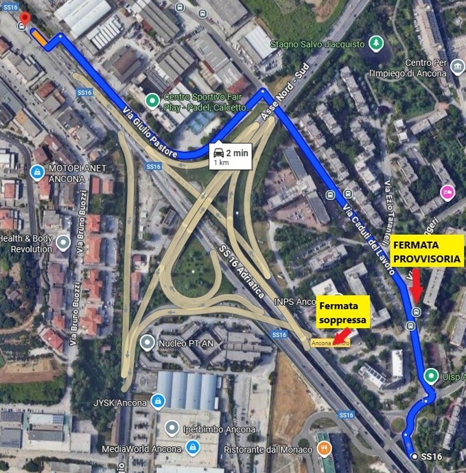 Direzione Ancona: dalla zona Sud, le corse giunte alla rotatoria (INPS) con Via Borsellino e Via Flavia, transiteranno in Via Caduti del Lavoro e Via Pastore fino al ponticello per raggiungere la Statale 16, riprendendo poi il percorso abituale.